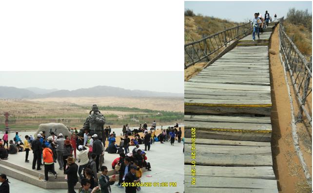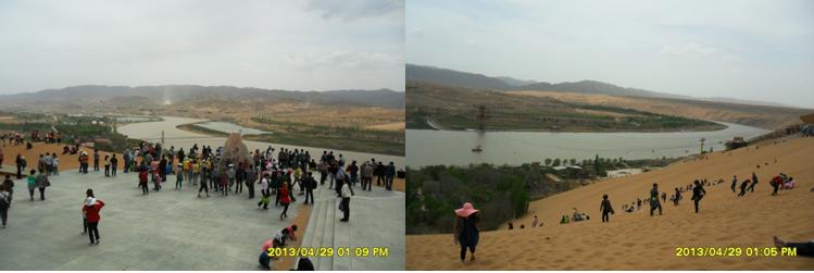沿著黃河?xùn)|岸,由南向北,走在河岸邊的木質(zhì)人行棧道上,微風(fēng)輕拂,游客熙熙攘攘。棧道下面,不時(shí)發(fā)出一陣陣黃河浪拍打岸邊卵石的聲音,棧道西側(cè)是廣際的黃河河面,沙坡頭特有的羊皮筏子載著游客,順著主河道東側(cè)漂流而過,偶爾漂入浪谷,游客不時(shí)發(fā)出一些驚嚇聲;主河道及西側(cè),間或有旅游快艇飛馳而過,拉起一道道浪花。棧道東側(cè)是旅游觀光車的通道,乘坐觀光車每人次費(fèi)用20元,觀光車駕駛員兼講解員,沿途不停的向游客解說景點(diǎn)。路邊涼皮、涼面小攤,食物價(jià)格不菲,一份6元的涼皮、涼面賣到10元,一只4元的鹵雞腿售價(jià)7元,普通瓶裝健力寶等飲料賣到5元,比市區(qū)價(jià)格多出2元。
